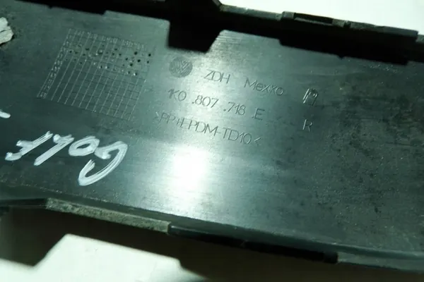 Käytetty etupuskuri oikea trim VW GOLF V VARIANT (1K5), OEM-osanumero 1K0807718E. Tämä osa on alkuperäisessä laadussa ja merkitty ajoneuvon valmistajan logolla (OE). Se soveltuu henkilöautoille ja on tarkoitettu ajoneuvon etuosaan.