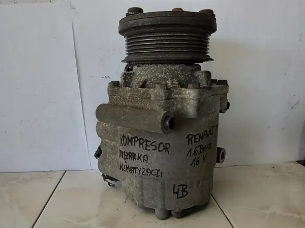 Käytetty ilmastointikompresori RENAULT MODUS 1.6B 16V:lle. Osa on alkuperäinen ja toimiva, kuten kuvissa näkyy. Osanumero: 2S6H-19D629-AB.