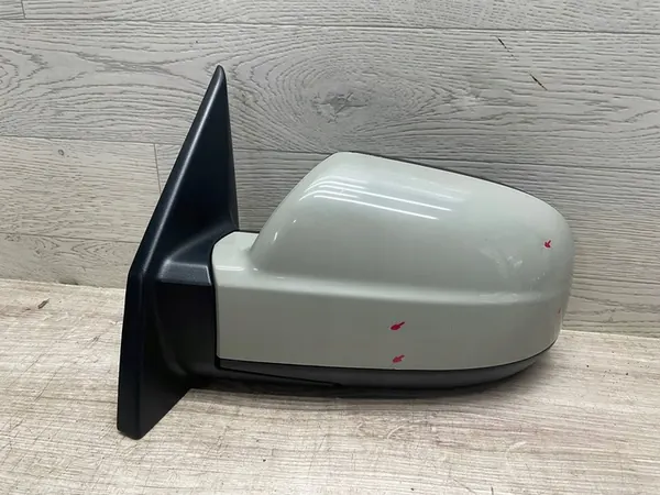 Vasemman etupeili Hyundai Tucson II:lle. Peilissä on haljennut kotelo ja lieviä muotoiluvikoja kuvissa näkyvillä alueilla, mutta muuten se näyttää normaaleilta käytön jäljiltä. Kuvissa näkyy tuotteen todellinen kunto.