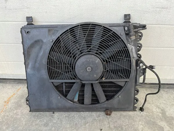 Ilmastointifani Mercedes W124 S124 C124 A124Z:lle M111-moottorilla: E200, 200E, 200CE, 200TE, E220, 220E, 220, 220TE, 220CE. Fani on hyvässä toimintakunnossa. Jäähdytin on mukana ilmaiseksi, mutta siihen ei anneta takuuta. Tämä osa poistettiin toimivasta ilmastointijärjestelmästä.