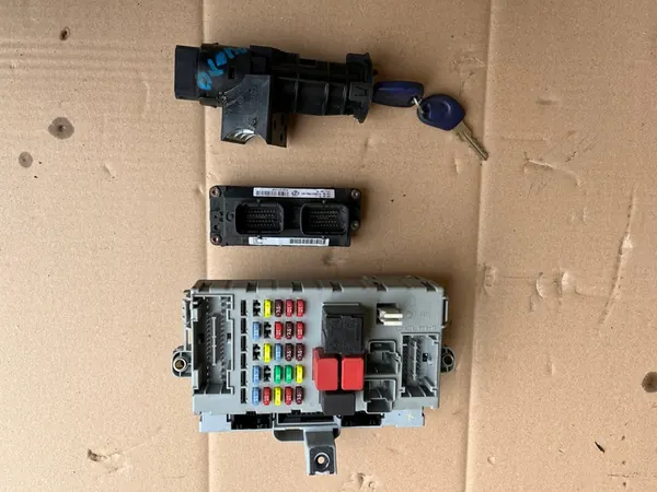 Käynnistyssetti Fiat Punto II 2003-2005 1.2. Tämä setti sisältää komponentteja, kuten ECU:n, sulakerasian, sytytyskytkimen ja avaimen. Se on toimintakunnossa ja eurooppalainen versio. OEM-osanumeroita ovat 55192306 ja 51744896.