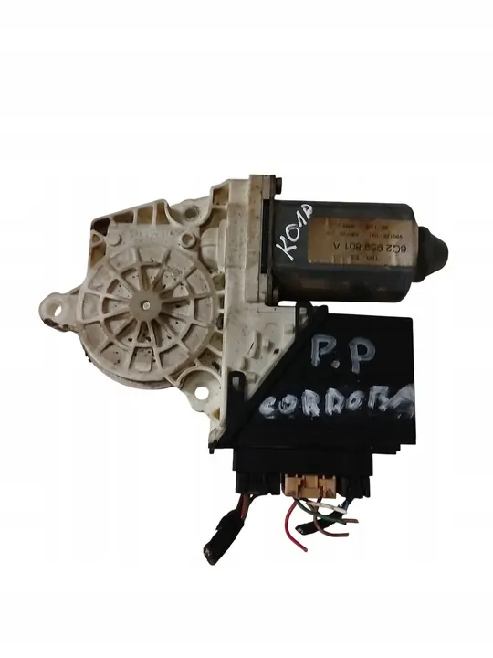 Käytetty oikea etuikkunan moottori SEAT CORDOBA:lle, OEM 6Q2959801A. Osa näyttää näkyviä käytön jälkiä, mukaan lukien naarmuja ja kulumia. Se on toimiva ja valmis asennettavaksi.